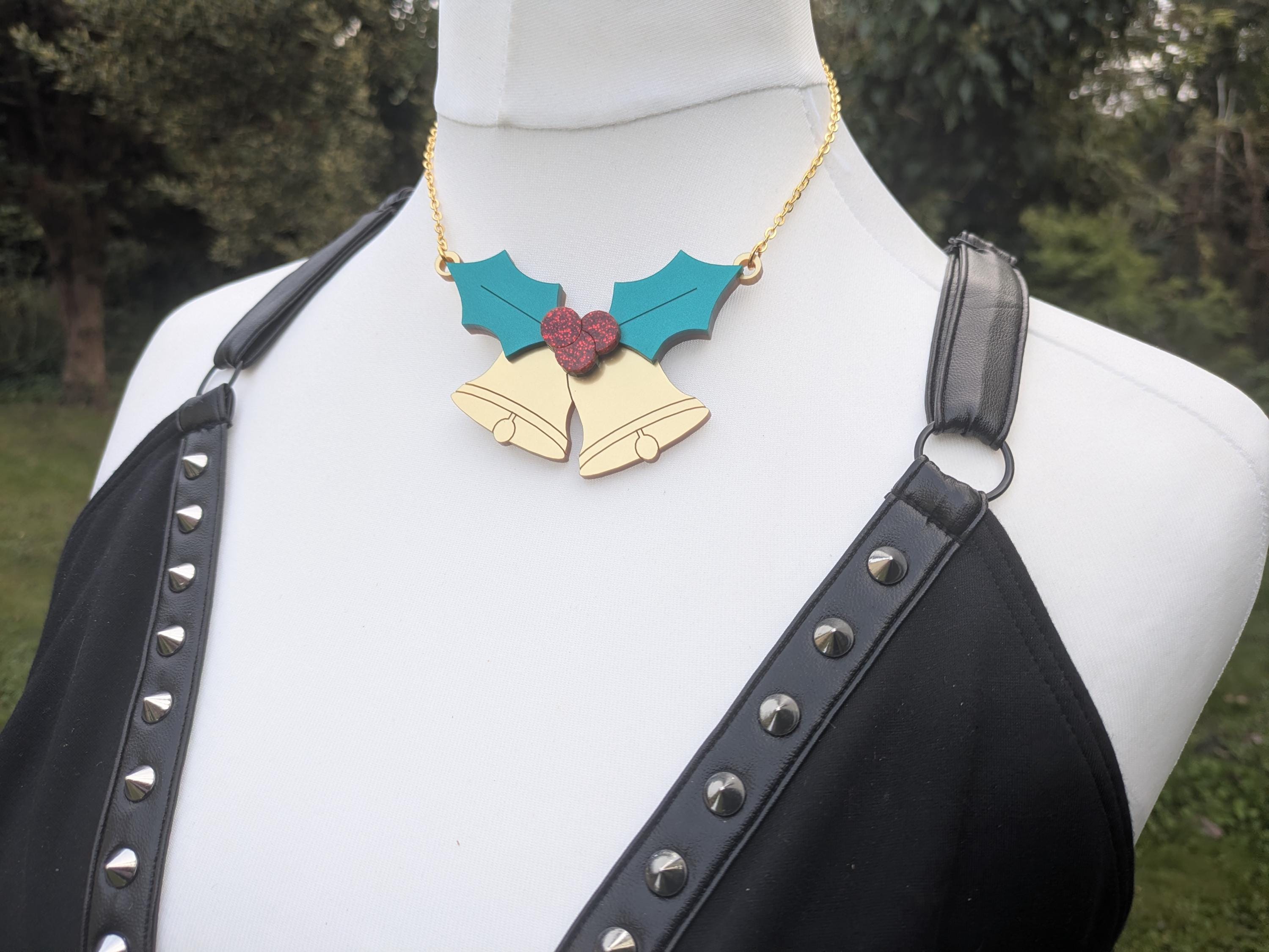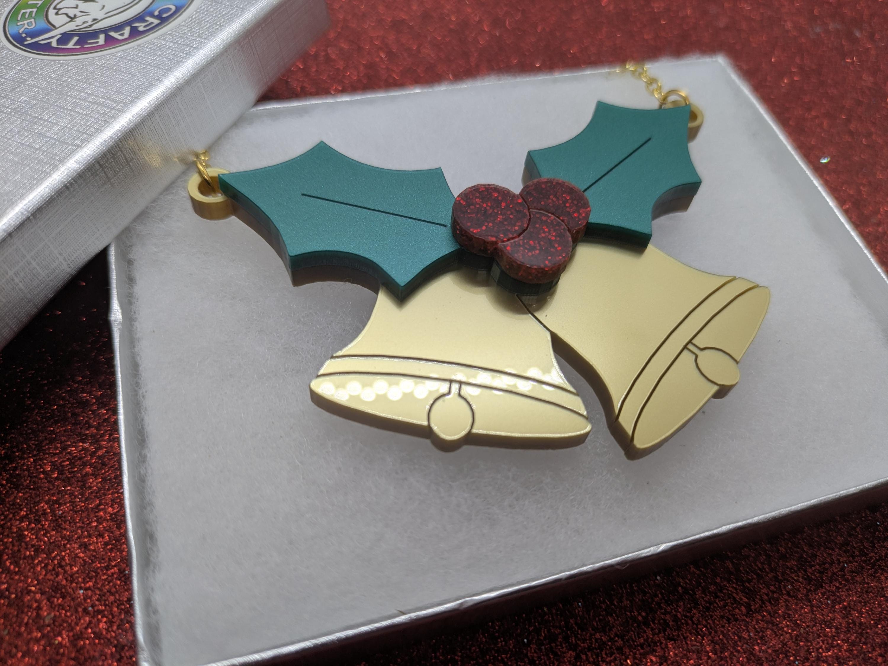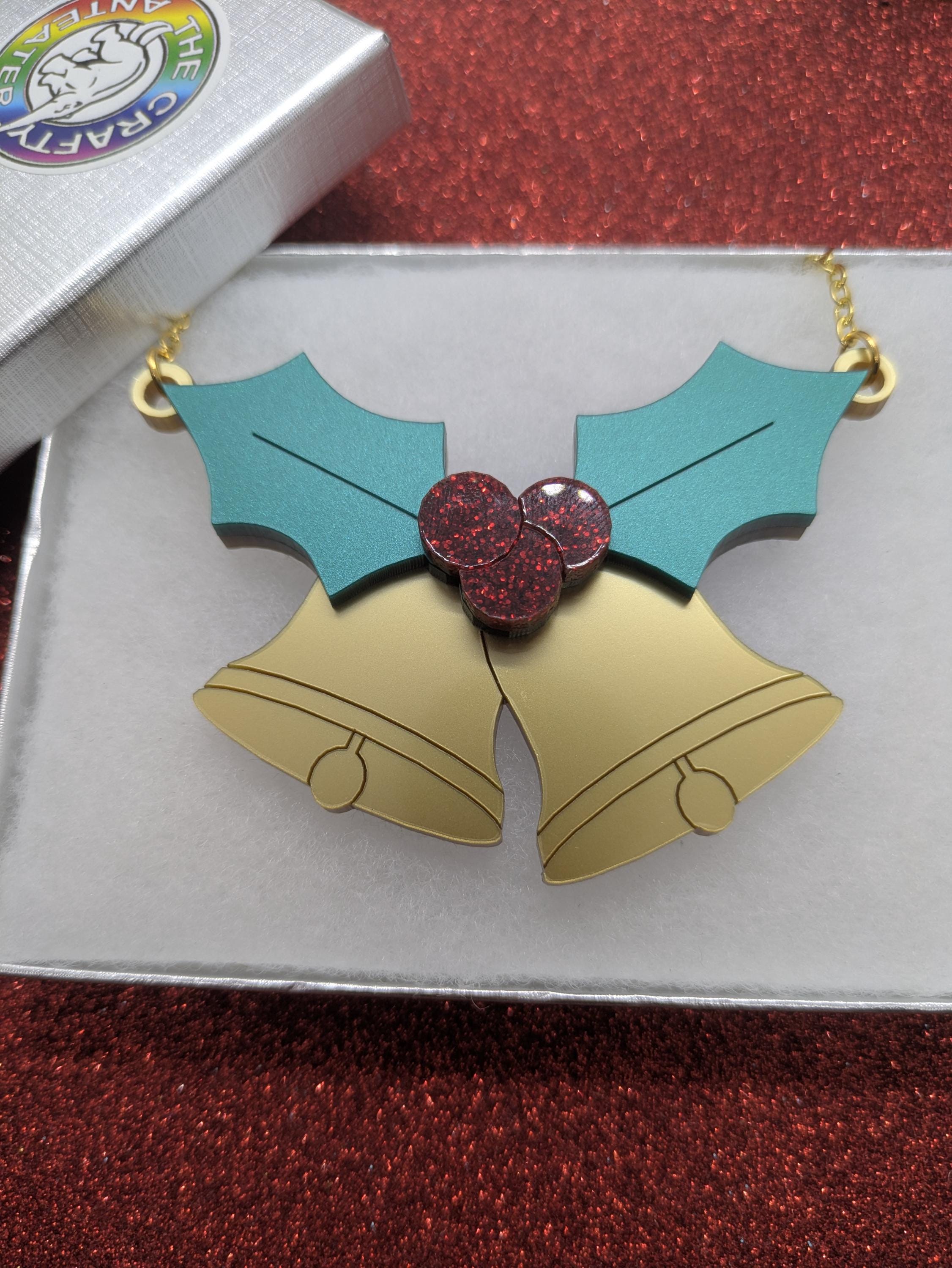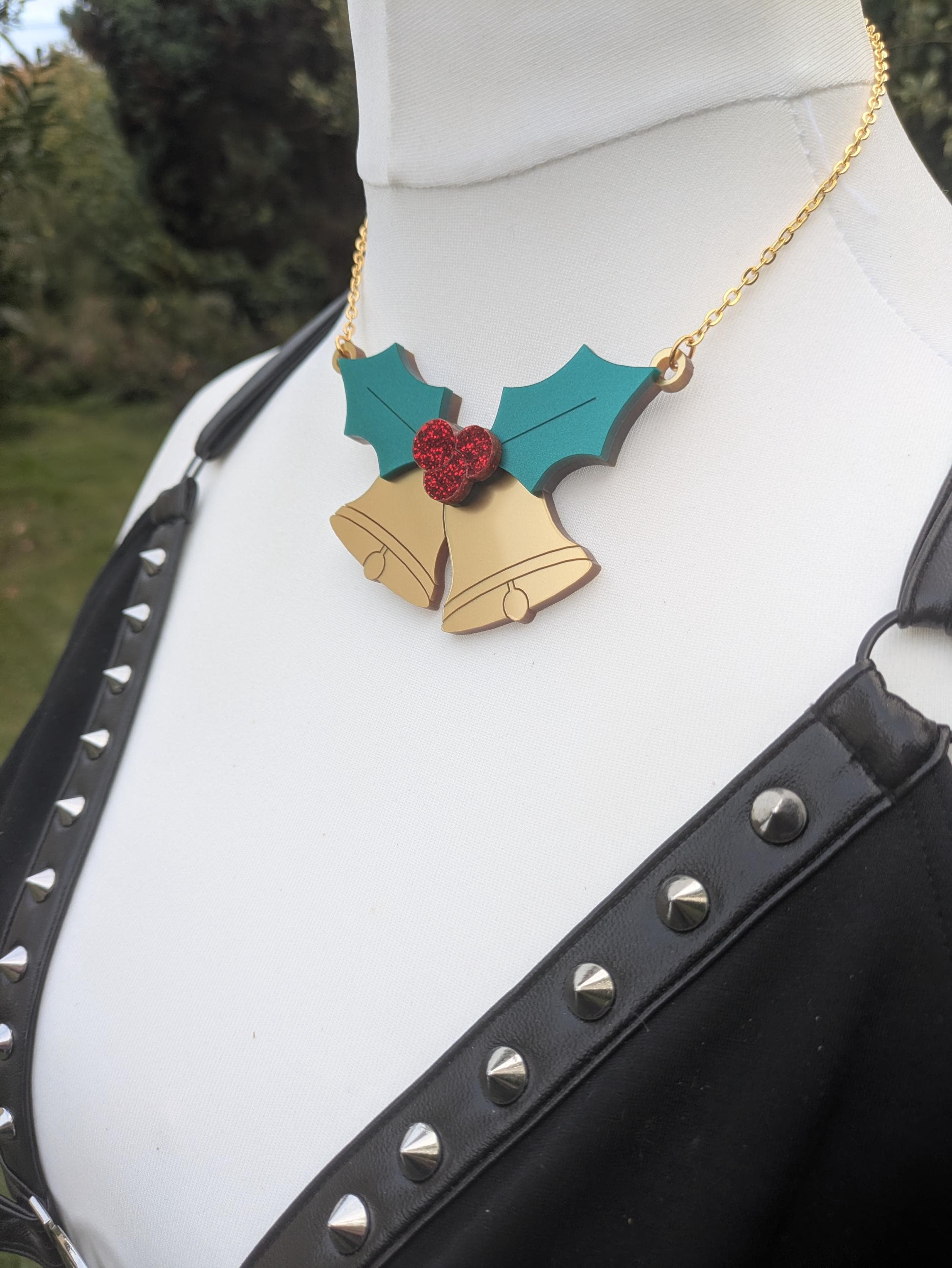 A Laser cut acrylic Holly Necklace with Gold Bells.