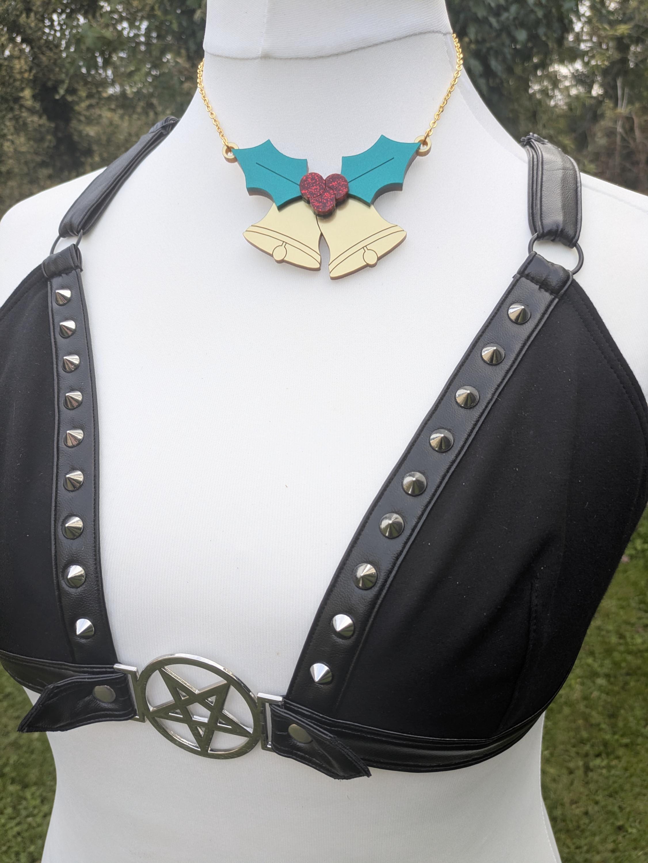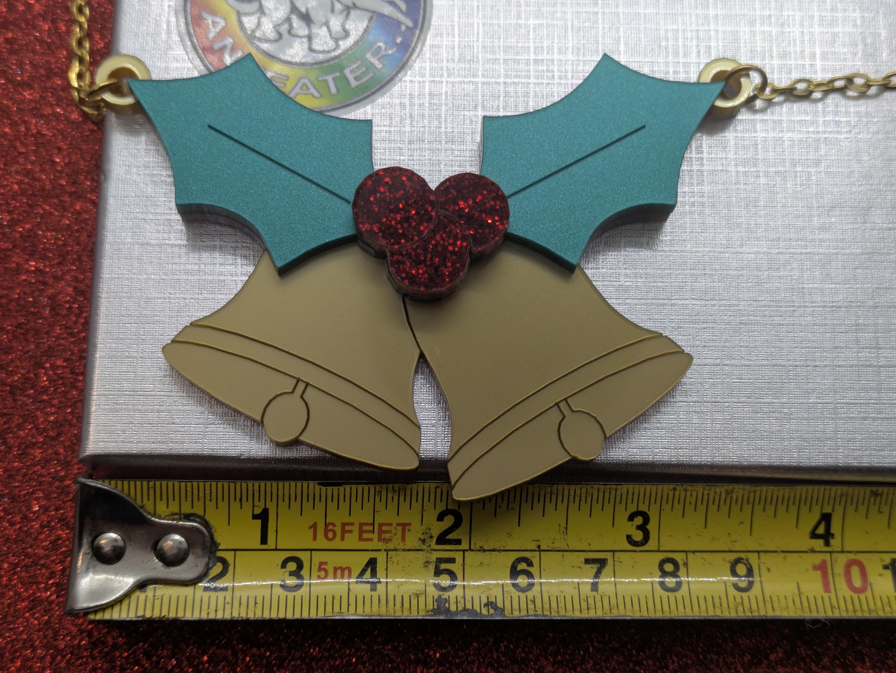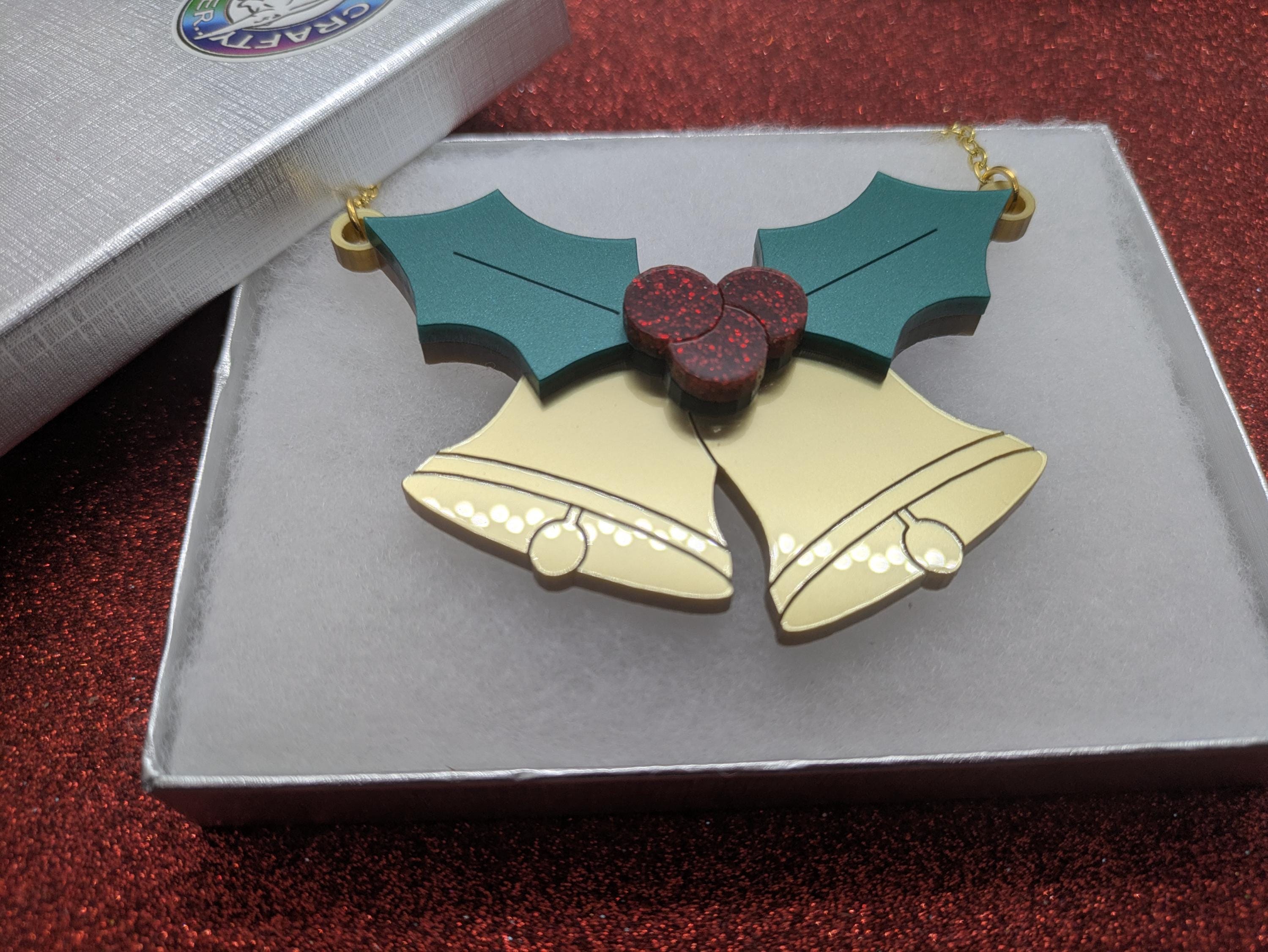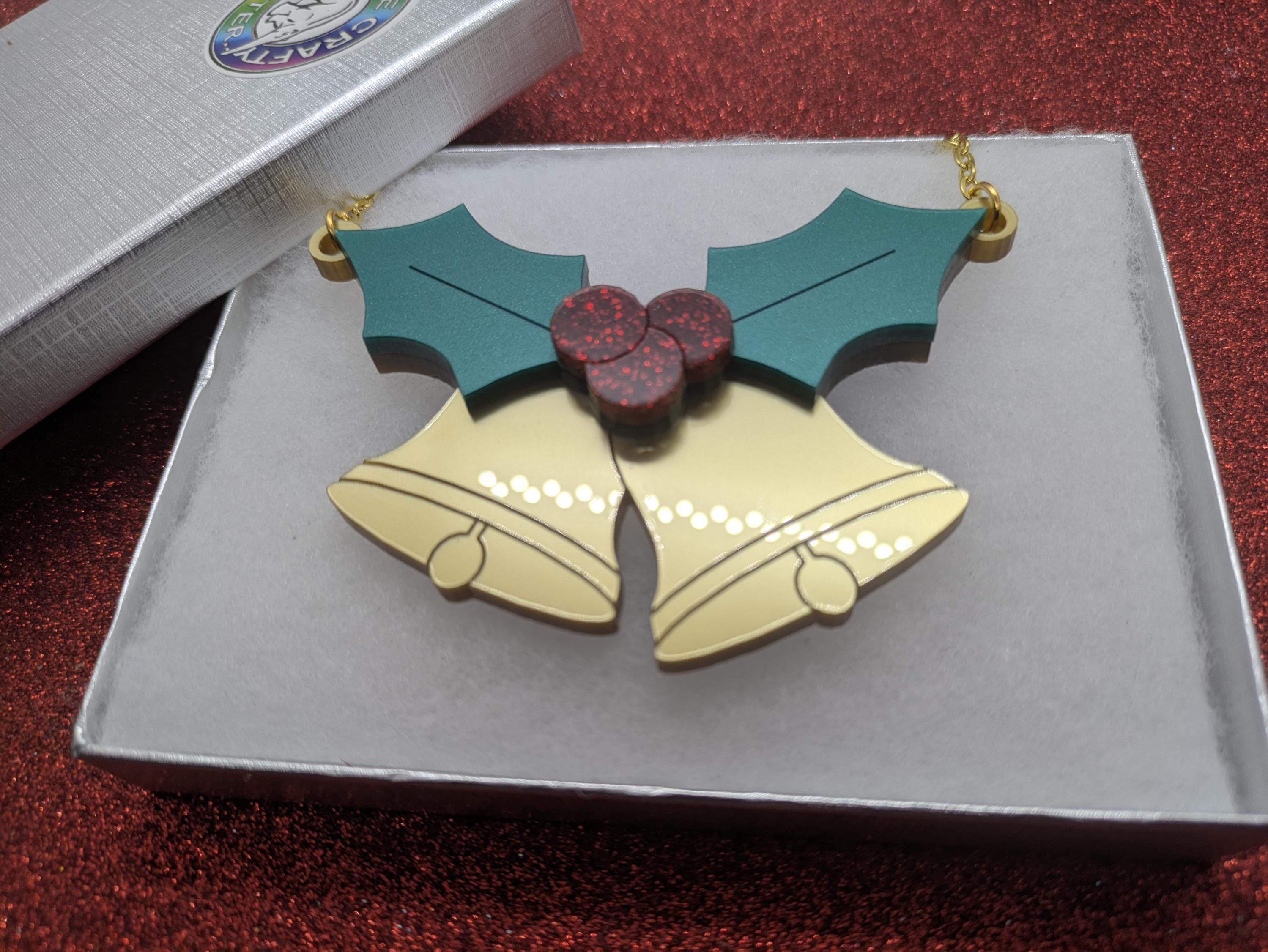 A Laser cut acrylic Holly Necklace with Gold Bells.